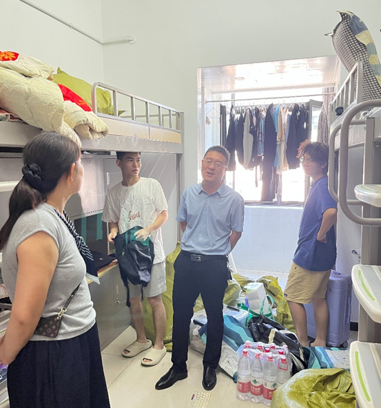秋风送爽启新程,温情关怀暖人心。随着河北地质大学整体搬迁至新校区,新学期的序幕正式拉开。为深入了解水资源与环境学院学子在新校区的住宿情况,传递学院对学生的深切关怀,助力同学们快速适应新环境、开启新学期生活,开学伊始,学院院长崔邢涛、副院长陈康、党委副书记张丽娜、各年级辅导员(2022级姜晓雪、2023级付志静、2024级王美云、2025级马宇帆),深入新校区学生宿舍,开展走访慰问与安全巡查工作。