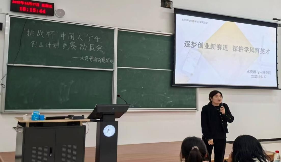 2025 年 10 月 17 日,河北地质大学水资源与环境学院在教学 1 号楼 111 教室举办 “挑战杯” 创业计划竞赛宣讲会。本次宣讲会以 “逐梦创业新赛道,深耕学风育英才” 为主题,吸引学院师生踊跃参与,现场科创氛围十分热烈。